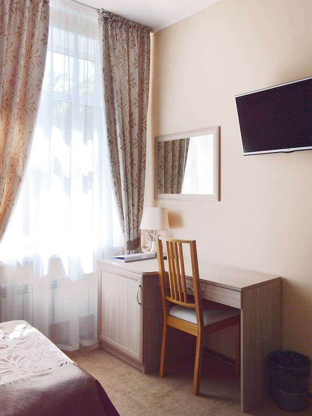 В комнате: односпальная кровать, платяной шкаф, багажница, зеркало в рост, телевизор, рабочий стол, стул, телефон, стакан, холодильник, чайная пара, чайник электрический, информационная папка. Комплект постельного белья, комплект из 3-х полотенец. Общая площадь номера: 14 м2.