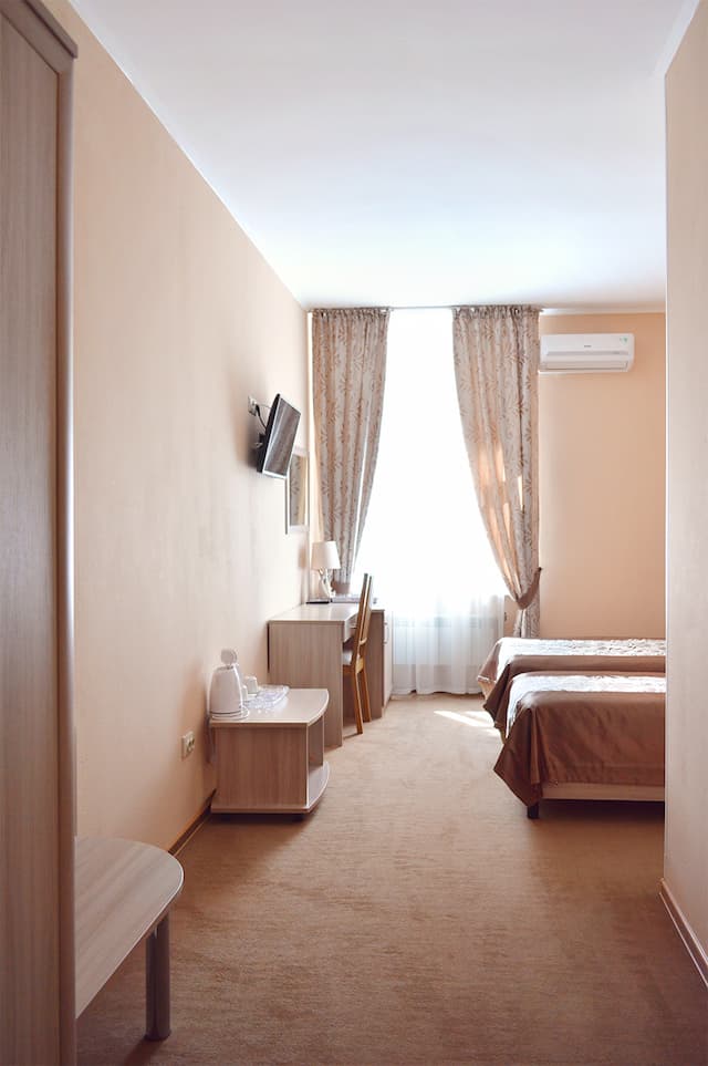 В комнате: две односпальные кровати, платяной шкаф, багажница, зеркало в рост, телевизор, рабочий стол, стул, телефон, стакан, холодильник, чайная пара, чайник электрический, информационная папка. Возможность установки дополнительного спального места (специализированная гостиничная раскладушка с матрасом, комплект постельного белья, комплект из 3-х полотенец). Общая площадь номера: 19 м2.